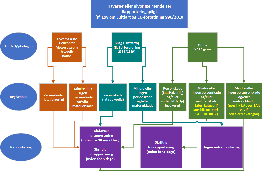 Af hensyn til et efterfølgende undersøgelsesforløb skal enhver berørt person (eksempelvis en fartøjschef, en operatør, en flyveleder, en flyejer, en lufthavnsejer eller en flyveunion) jf. EU-forordning 996/2010 og gældende dansk lovgivning straks informere Havarikommissionen om et flyvehavari eller en alvorlig flyvehændelse på dansk, færøsk eller grønlandsk territorium.